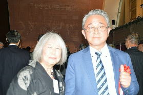 | 野中さんの恩師瀧石誠司先生から花束贈呈 | 「さよならは言わない」斉唱中@ | ||