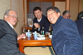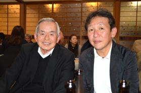 | 2次会中(福田前同窓会副会長と) | 2次会中(西川前同窓会会長ら) | ||