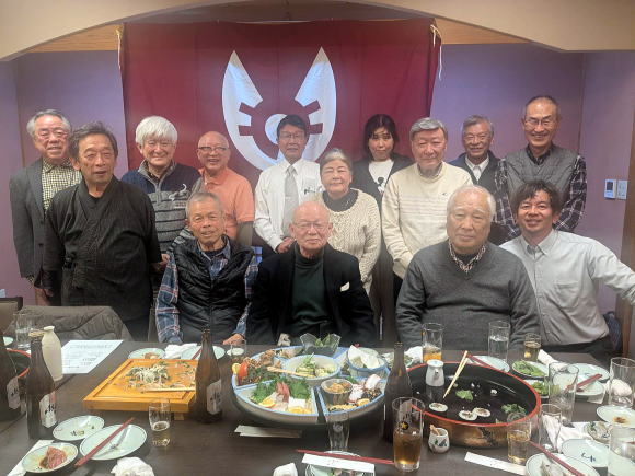 2期生の竹中先輩、溝渕先輩を頭に総勢14名、近況報告と今年の思いを述べ、これからも元気にこの会に参加しようと誓いました。そして学芸讃歌の大合唱の後、支部旗の前で記念撮影をし閉会となりました。