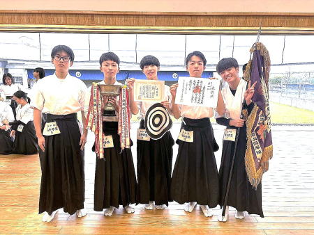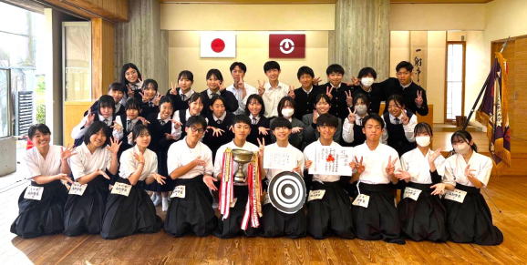 | 2011(平成23)年9月17日(土)〜18日(日)に高知市の高知県弓道場で行われた平成23年度高知県高校弓道秋季大会で学芸高校弓道部の学芸A(森部・西田・久保田・市川組)が男子団体で初優勝し、女子団体で学芸A、学芸Bの2チームがベスト8に進出しました。また、男子個人の部の2年・3年では、森部佑耶(2年)くんが3位に入賞し、中城海咲(1年)さんが女子団体優秀選手賞を受賞しました。 |