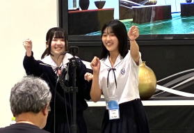 高知学芸高校華道部からは3チームが出場。そのうち、1チーム<吐夏家(とかげ)>が、みごと予選リーグを2位で通過。決勝トーナメントに駒を進めました。残念ながら、準決勝戦で敗れはしましたが、高知県勢で決勝トーナメントに進出できたのは、橋田妃夏璃 (2年)さんと 岩村和夏子 (2年)さんのペアの<吐夏家>1チームのみでした。