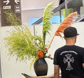 ※バトルは、2人1組で5分以内で交代し、指定された花器に花や樹木をいけて対戦します。その結果、予選の点数の高い上位4チームが決勝トーナメントに進出できます。 |