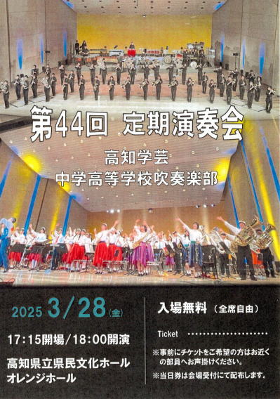 2025(令和7)年10月13日(土)に愛媛県西条市の西条市総合体育館で開かれた第38回全日本マーチングコンテスト四国支部大会で高知学芸高校吹奏楽部が、高等学校以上の部で金賞を受賞し、全国大会に四国支部代表として3年連続13度目の出場します。同時に、高知学芸中学校吹奏楽部も、中学生の部で金賞を受賞し全国大会に出場します。中学・高校の2部門で全国大会出場は、大会史上初の快挙です。