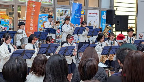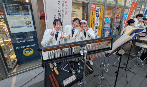 9月は帯屋町筋を中学生とともにパレードさせていただきましたが、今回は高校生のステージです。お天気が心配されましたが、日を追うごとに雨から曇り、曇りから晴れにかわり、12月の高知を象徴する青空にかわりました。